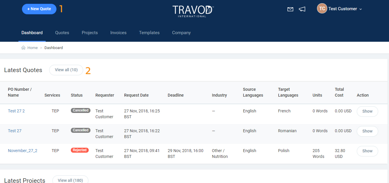 Once you have approved the Quote, the system will automatically create a project (1) and the status of the quote will change (2).